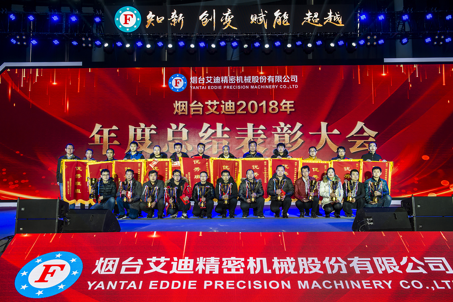 2019年1月20日上午,烟台艾迪2018年度总结表彰大会暨2019年新春联欢会在国奥俱乐部隆重举行。本次大会以“知新、创变、赋能、超越”为主题,共总结表彰先进团体35个,优秀工作者79人,其他单项奖项145项,公司领导为先进团体和个人颁发锦旗、证书和奖金奖杯,表彰大会在鼓舞先进工作者的同时,也激发了公司员工向先进看齐,争先创优的斗志,营造了为艾迪发展贡献力量的氛围。