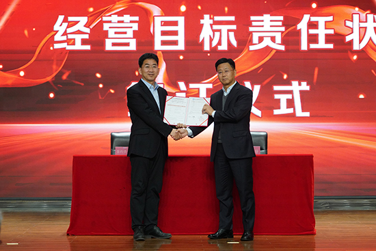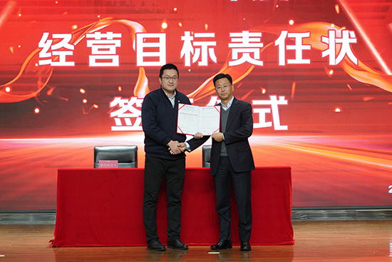 大会进行第一项,公司与各子公司的高管团队签订经营目标责任状,艾迪高管团队依次上台与董事长进行签约。