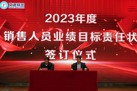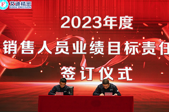 1月19日,烟台艾迪精密机械股份有限公司“乘风破浪 砥砺前行 勇挑重担 向公司成立20周年献礼”2023年度经营目标责任状签订仪式圆满召开。公司全体中高层管理人员及销售人员参会,艾迪精密副总经理兼董事会秘书李娇云主持会议。