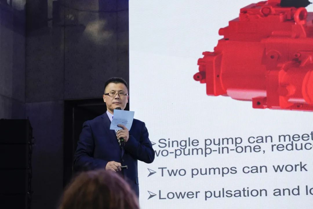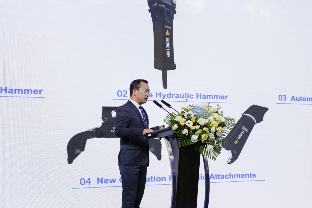 随后,在新产品发布会上,艾迪精密推出多款重型液压破碎锤、纯液压破碎锤、自动变频锤、新一代液压属具,以及大排量柱塞泵、高速泵、机电液一体回转马达、电驱回转马达、大排量行走马达、全电控多路阀等新产品,从产品优势及创新点出发,助力客户实现价值提升。
